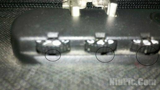 2、先把三个密码轮的凹点都调整到下方方向!(手机勉强拍了一个,黑圈里的就是凹点!)