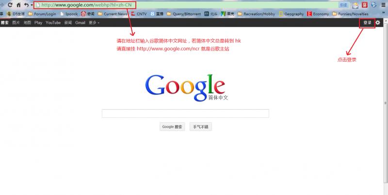 1、打开代理、翻墙,在地址栏输入谷歌简体中文网址http://www.google.com/webhp?hl=zh-CN,若简体中文一直转向hk,则输入http://www.google.com/ncr,便可直接连接谷歌主站。然后点击右上角的登陆。
