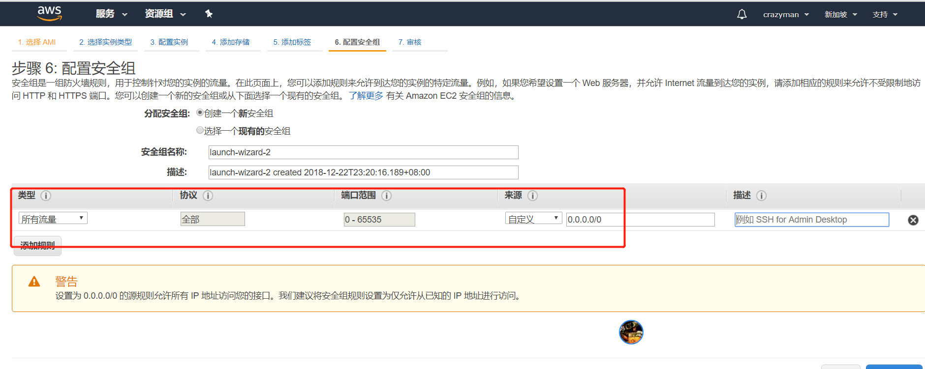 配置安全组规则,选择所有流量来源0.0.0.0/0(这个就是防火墙准入规则,可以自定义设置允许哪些IP和端口可以进来),这一步好了哦,直接启动实例。(我选择的地区是新加坡,虽然免费的带宽只有1M,查资料看技术区够了)