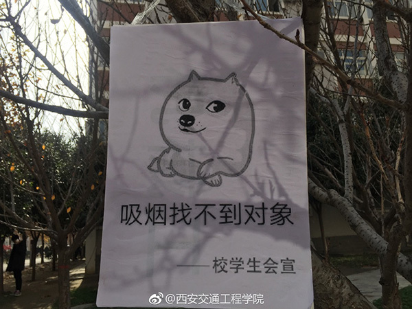 11月28日,@西安交通工程学院官方微博发布了9张禁烟宣传照片,并配以文字:“这一波禁烟宣传很强势!”这9张照片中每一张都选用当红的微信、QQ聊天表情包,并配以标语。