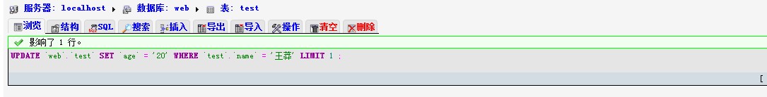- UPDATE `web`.`test` SET `age` = '20' WHERE `test`.`name` = '王莽' LIMIT 1 ;