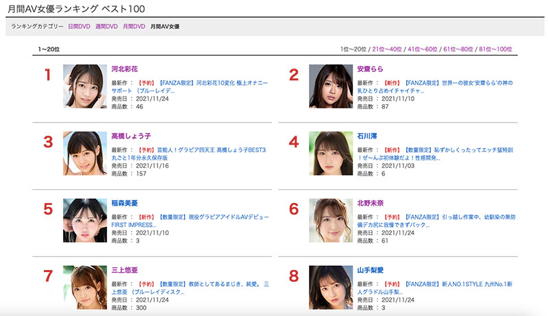 只是调动三上悠亜实在让人蛮惊讶的,以上个月的销售排名来看,三上一共有3支作品进入百大,排名分别是21、77、98(两支是这个月预约的片子,一支是上个月已经发售的作品),累积销售量的排名则是第7,虽然没有作品打进前20名,但总销售量在S1也只输给了安斋らら(安斋拉拉)和河北彩花两位女优,结果S1竟然在2021年的最后一个月调整她的档期?很文博客-https://www.hinku.com/13261.html