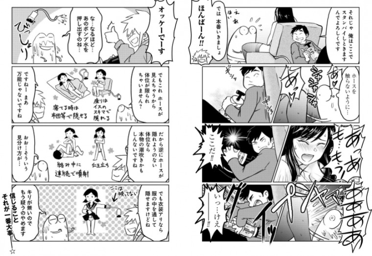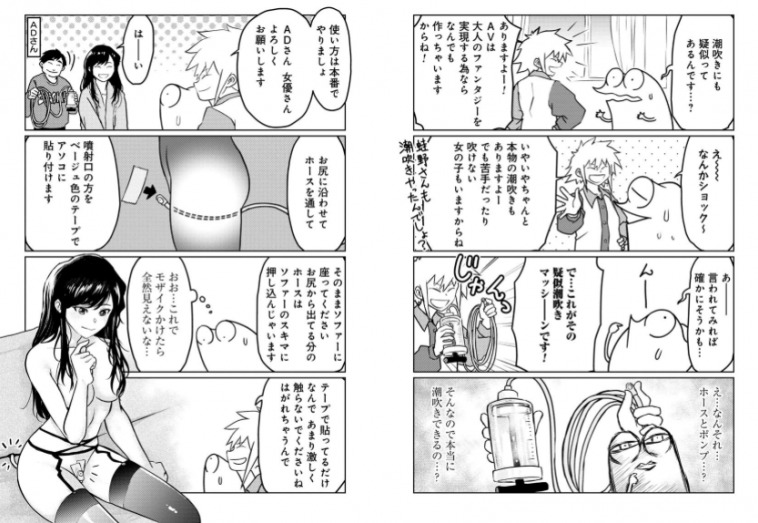 沙发就是玄机所在,透过AV男优漫画家“蛙野”的作品你就知道工作人员会事先把水管用胶带黏在女优的该边,然后把管子从椅背和坐垫之间的空隙拉出去,最后再盖上一块布防止穿帮;如果觉得这样还不保险,那就请女优再穿上内衣及吊带袜掩护,马赛克打上去就很难察觉到不对劲的地方: