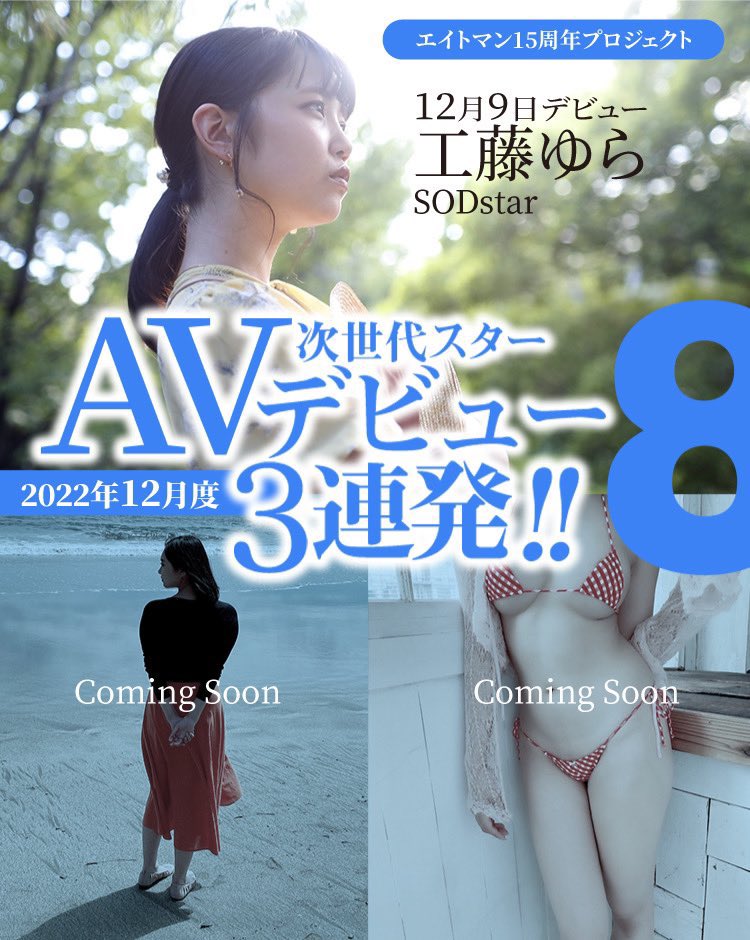 十有八九,她就是之前8MAN预告要在S1现身的新人,再加上已经在SOD STAR登场的工藤ゆら(工藤由罗)以及将于12月3日情报解禁、号称是游说了5年才答应下海的神秘女郎,看来迎接成立15周年的这家事务所真是火力大放送,不只动员女优举办写真展,岁末还有一波大型新人连续登场,就是要争业界龙头〜
