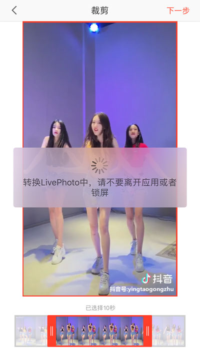 5.拖动底部滑条,裁剪视频长度,点击下一步,即可进行转换成“live photo”。