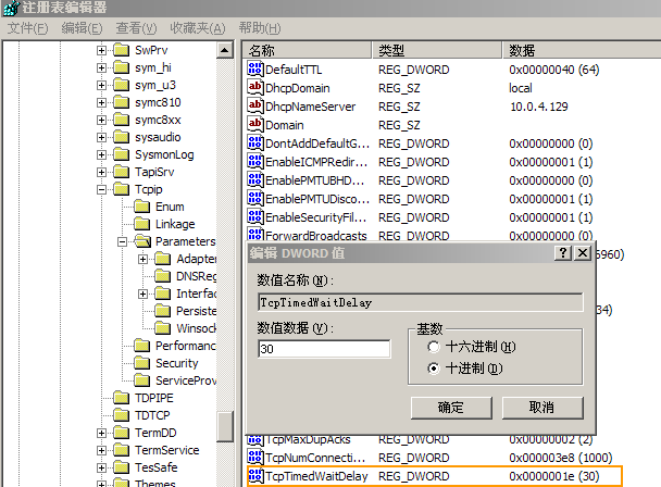 4)如果在刷新后偶尔能够正常显示而且服务器是Windows系统的话,那么减小Windows中TcpTimedWaitDelay时间可解决此类问题,默认情况下为240(未设置的情况下也是这个数值)此项设置需要到注册表如下位置进行设置HKEY_LOCAL_MACHINE\SYSTEM\CurrentControlSet\Services\Tcpip\Parameters\TcpTimedWaitDelay 如果注册表中没有TcpTimedWaitDelay这个项目,请增加这个项目,并设置为双字节(DWORD)类型数值设置为30 ~ 60 之间即可