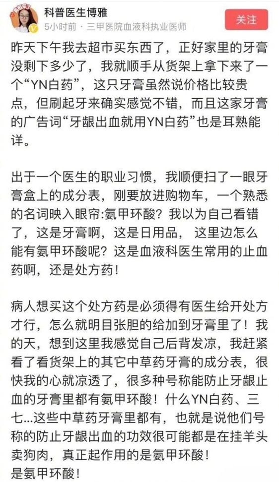 日前,@科普医生博雅 在新浪微博上发布的一则讯息在各大社交圈引起轩然大波。该博主被认证为三甲医院血液科执业医师,于微博中透露自己于超市购物时,发现知名牙膏品牌云南白药(000538-CN)牙膏中含有止血西药成分——氨甲环酸。(该条微博已删除)很文博客-https://www.hinku.com/15748.html