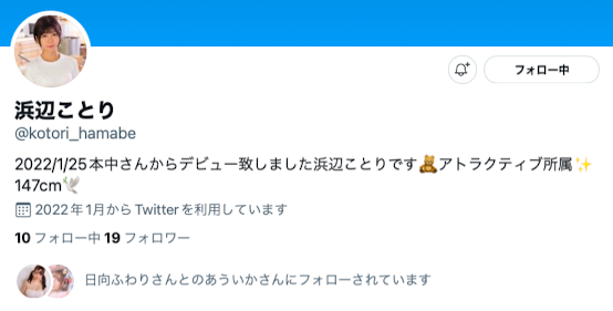身为本中在2022年推出的新人,浜辺ことり(滨边小鸟)是蛮特别的一位,你说她不重要嘛还真不重要,因为4位新人只有她在首页没有Banner,但和其他同时出道的女优她却好像又有点重要,因为她是有twitter、有亮出事务所招牌的新人: