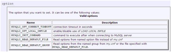 - $mysqli->options(MYSQLI_OPT_CONNECT_TIMEOUT, 5);