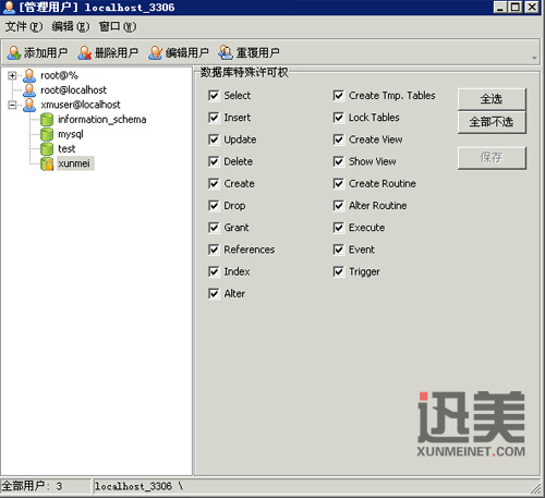 ,展开就可以看到多个数据库。点到刚才建立的数据库xunmei再点击右边的“全选”,再点击“保存”。这时xunmei数据库上会有一个黄色锁图标,它表示xmuser用户对xunmei数据库有管理权限。如下图: