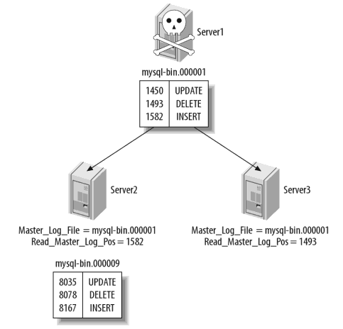 在一主(Server1)两从(Server2,、Server3)的环境中,Server1宕机后,等到Server1和Server2把宕机前同步到的日志都执行完,比较Master_Log_File和Read_Master_Log_Pos就可以判断出谁快谁慢,因为Server2从 Server1同步的数据(1582)比Server3从Server1同步的数据(1493)新,所以应该提升Server2为新的主服务器,那么 Server3在CHANGE MASTER TO到Server2的时候应该使用什么样的参数呢?1582-1493=89,而Server2的最后的二进制日志位置是8167,所以答案是 8167-89=8078。