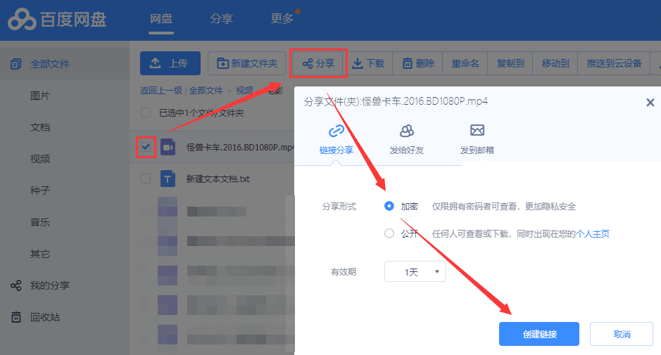 进入你的 百度网盘(https://pan.baidu.com/disk/home),然后找到你要下载的文件或文件夹,然后点击 分享 按钮,分享形式建议加密,至于有效期如果不需要经常下载那么设置 1天 就行了,免得时间长了分享了一堆文件,然后点击 创建链接 按钮。