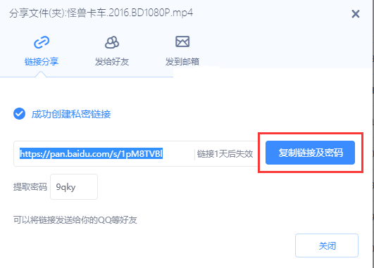 创建链接后,我们直接点击 复制链接及密码 按钮,然后就可以关闭百度云页面了。