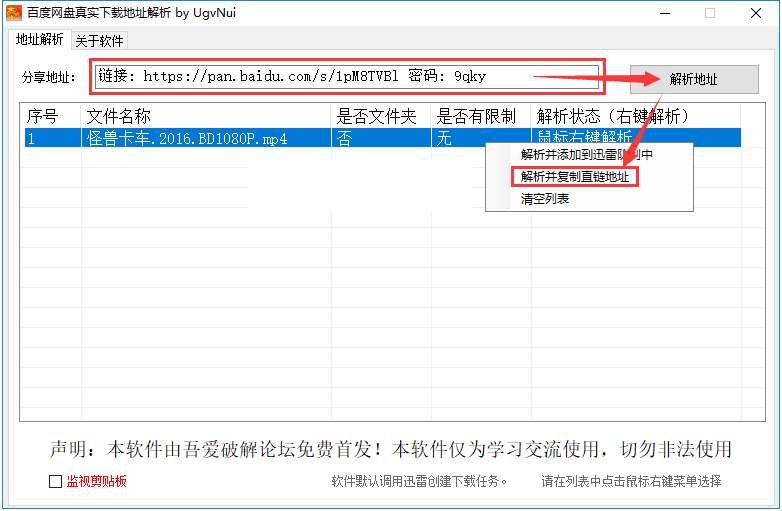 我们打开刚才下载的 百度云.exe 文件,然后如下图所示,粘贴刚才复制的链接信息到输入框内,然后点击 解析地址 按钮。
