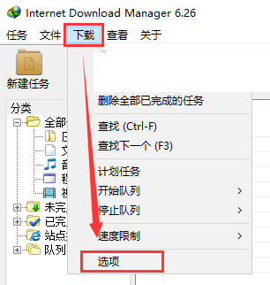 打开 IDM 软件后,点击顶部菜单栏 下载 - 选项 。