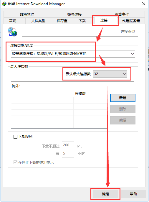 点击 连接 选项卡,连接类型/速度选择:较高速率链接... ,最大连接数根据情况选择:16/24/32 ,然后点击 确定 按钮。