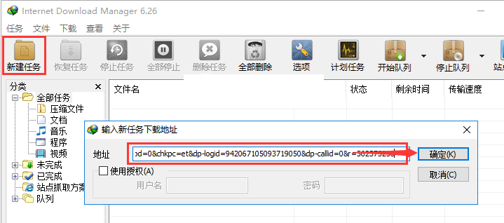 配置后,我们就可以新建任务了,点击 IDM 窗口上的 新建任务 按钮,因为前面我们已经复制了 真实下载链接,所以 IDM自动从剪辑板中提取了下载链接,我们只需要点击 确定 按钮即可。