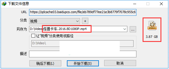 点击确定按钮后,就会显示下载文件信息,我们等几秒,IDM就会解析下载资源URL完成,右侧也会正常显示 文件格式图标和文件大小,并且文件名也识别正确,这时候我们就可以点击 开始下载 按钮下载了。
