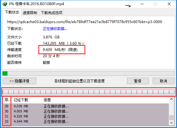 最后,我们就会看到如下图所示的下载界面了,我设置的是 32线程,最高速度能跑到 9MB/s,当然速度并不是很稳的,忽快忽慢的,平均 5-6 MB/s 还是有的,总归这个速度我已经满足了。
