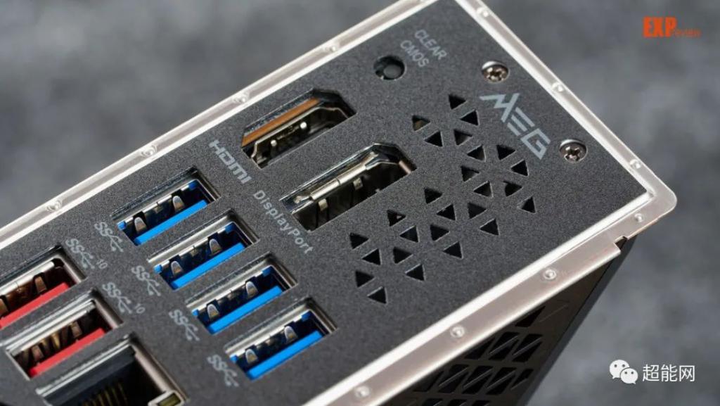 I/O 背板,这里的设计和上代的 MEG Z590I UNIFY 完全一样,有一把小风扇辅助供电散热,配备 4 个 USB 3.2 Gen 1