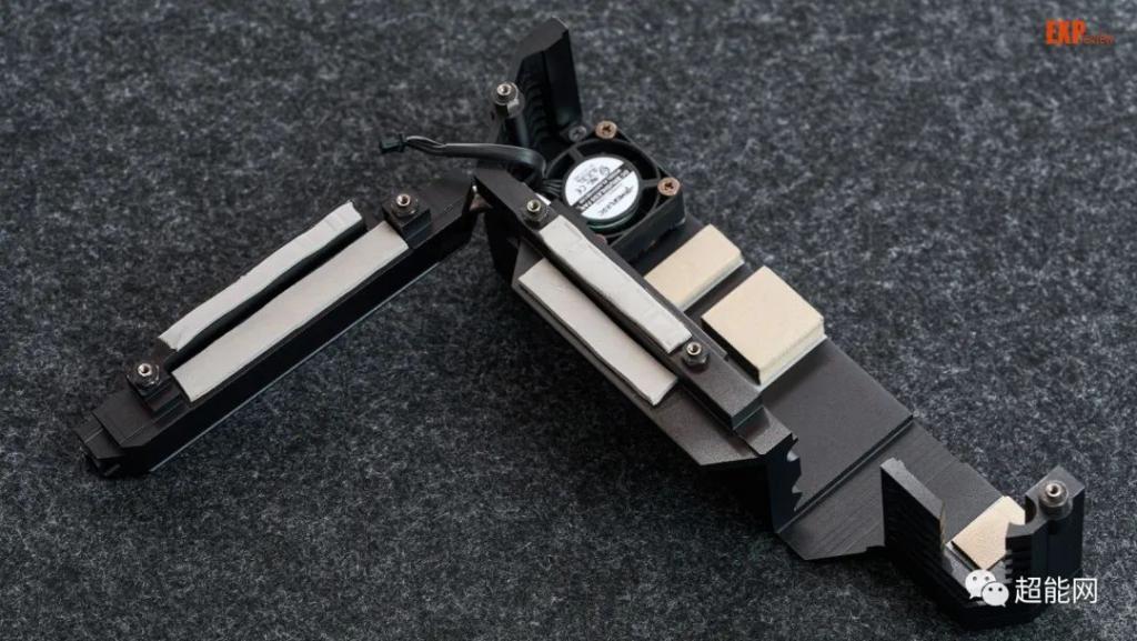SSD 的散热片,中间是一块扩展子卡,它用专用接口与主板连接,子卡正反面都有一个 M.2 口,均可安装 M.2 2280 规格的 SSD,上面的