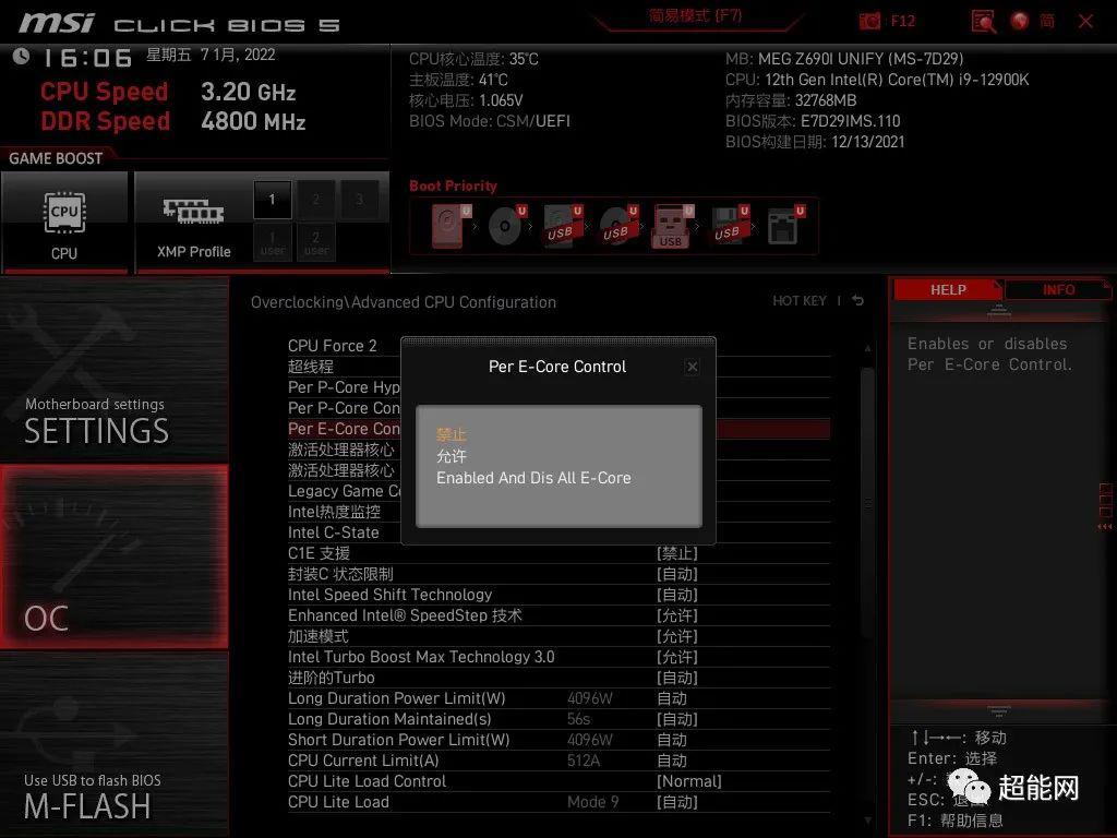 在高级模式的 OC 菜单下 CPU 高级设置里面可以快速关闭所有 E-Core,此后就可以把 AVX-512 选项改成 Enable,现版本的 BIOS 还是可以启用 AVX-512 的,之后就不知道了。