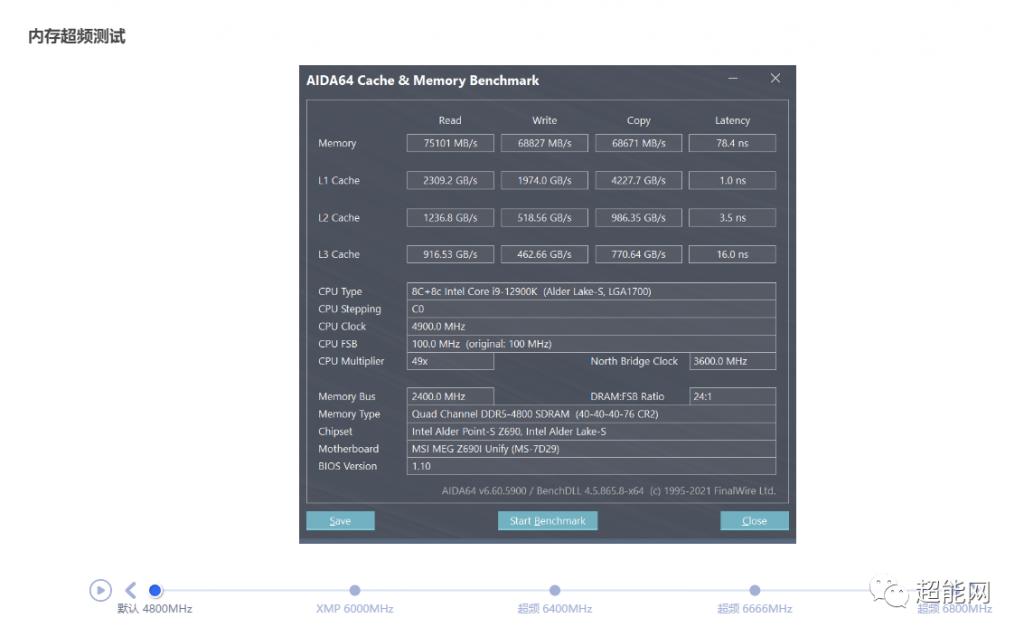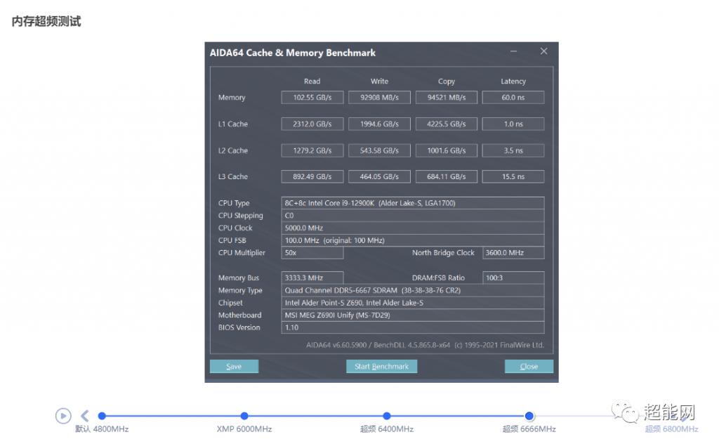 Z690I UNIFY 主板上可以直接超到 6800MHz,时序 38-38-38-76,内存读取带宽已经超过了 100GB/s,延迟也降低至