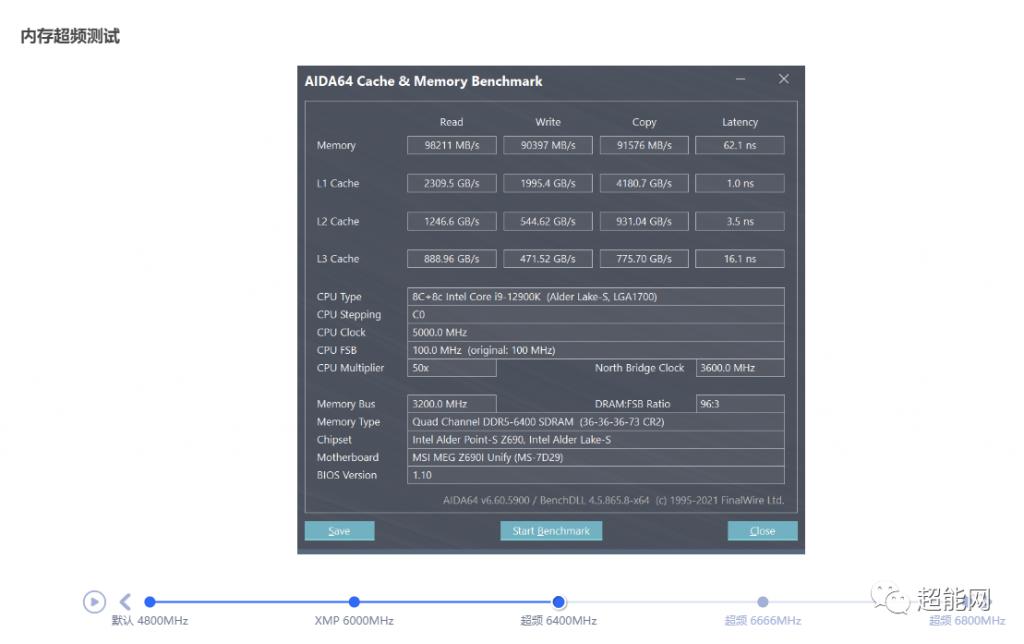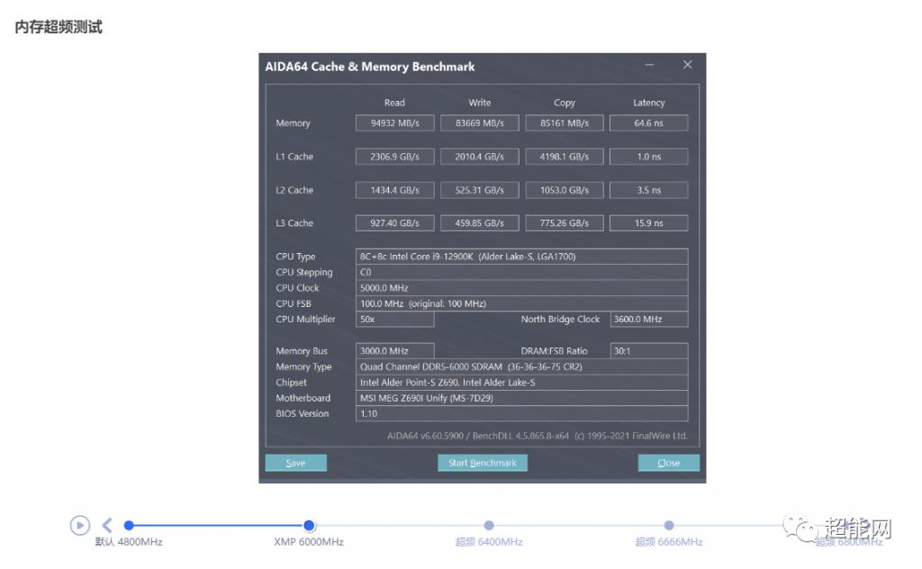DDR5-6000 CL36 套装来做的,这套内存在开启 XMP 后内存读取速度是 94GB/s,内存延迟 64.6ns,在微星 MEG