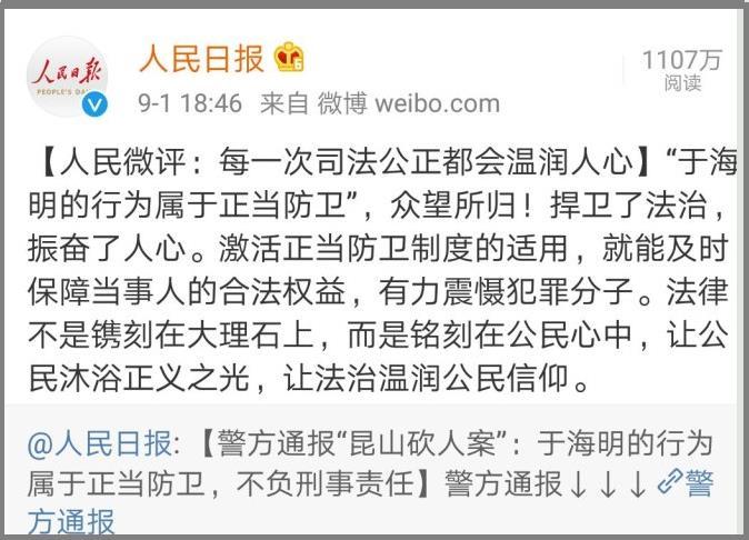 如今看来,“昆山反杀案”处理结果并未成为判例,但内蒙古高院的这个二审判决,明显与当前司法环境极不相称。因为就在前天,最高法表示“适时出台防卫过当的认定标准,鼓励正当防卫”。随后,检察日报发表《面对不法侵害正确的防卫姿势不该只是跑》,以示对国民行使正当防卫权的支持。