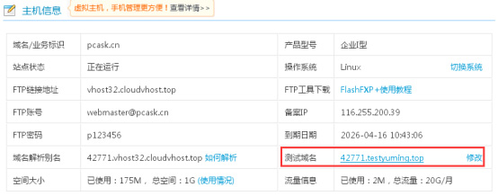 如果没有自己的域名,可以在主机管理平台申请测试域名,用来访问VIP视频解析网站。如图: