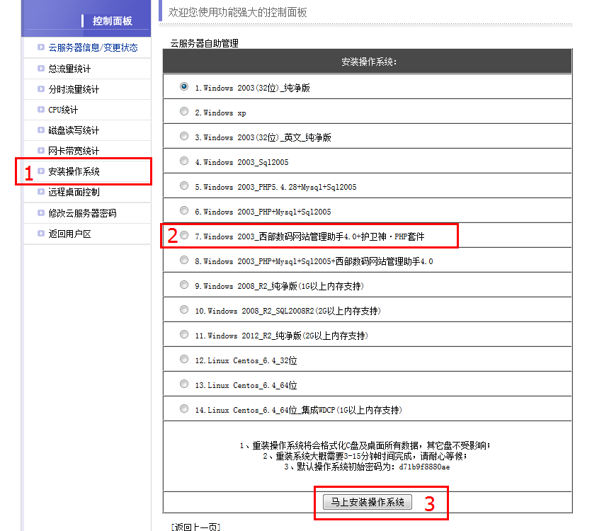 由上图可以看出,我们是准备安装:“Windows 2003_西部数码网站管理助手4.0+护卫神·PHP套件 ”这个系统,安装这个适合asp,php,html程序.