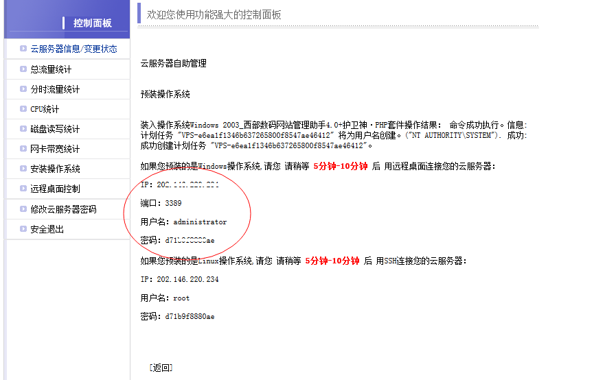 (其实在提交安装系统后,我们就能看到VPS的远程信息,入下图红圈所示: