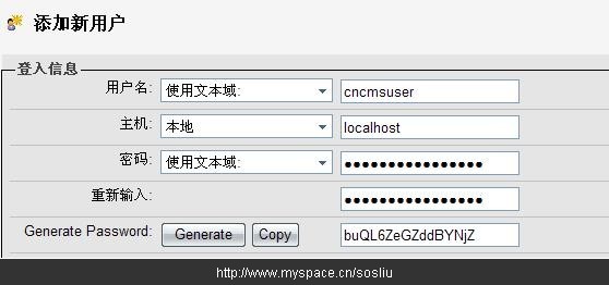 如上图,我们填写了用户名为:cncmsuser,该数据库用户只允许本机访问,主机一项选择本地;密码我们使用自动生成的,点下面的“Generate”会生成一个随机密码,然后点“Copy”会自动填写到密码框中。