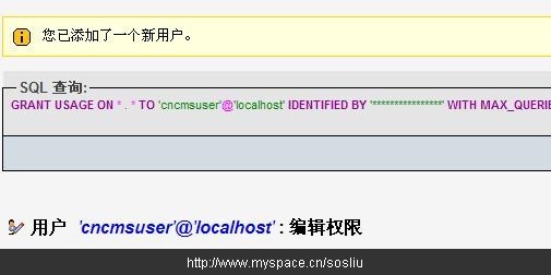到这里,我们已经全部设置完毕了,创建了一个数据库:cncmstest,并创建了数据库用户cncmsuser,特别指定了该用户只对cncmstest的访问权限。如此,便达到了我们一开始所讲的目的:为每一个数据库指定独立的用户访问权限。