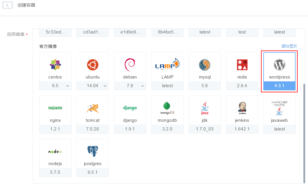 选择镜像时,在官方镜像中选择「wordpress」专用镜像,之后输入容器名称,点击「创建」即可: