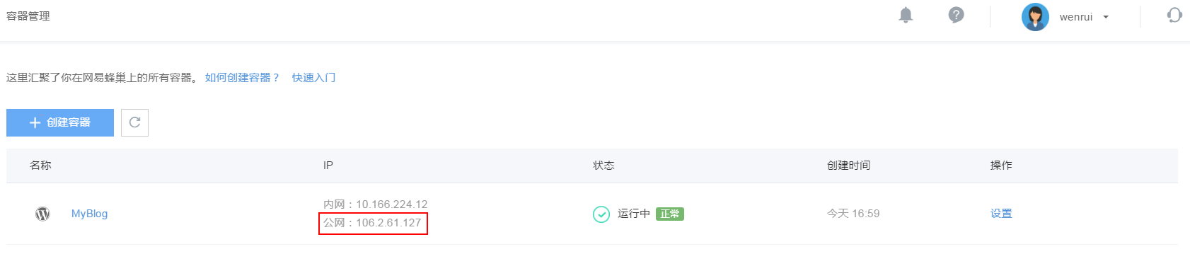 经过日志进度提示容器创建成功后,点击「容器管理」可以看到所创建的容器列表和对应的公网 IP: