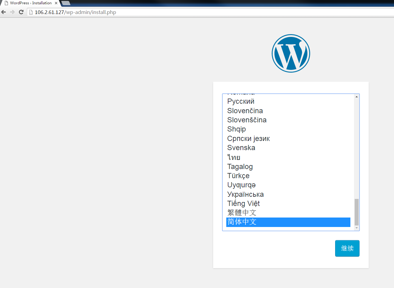用浏览器打开分配的 IP,进入安装界面,下拉框拉到最下方,选择「简体中文」,点击「继续」:
