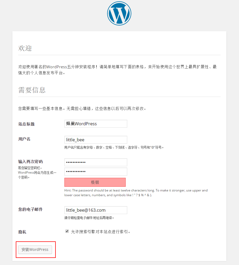 填写相关注册信息后,点击「安装 WordPress」: