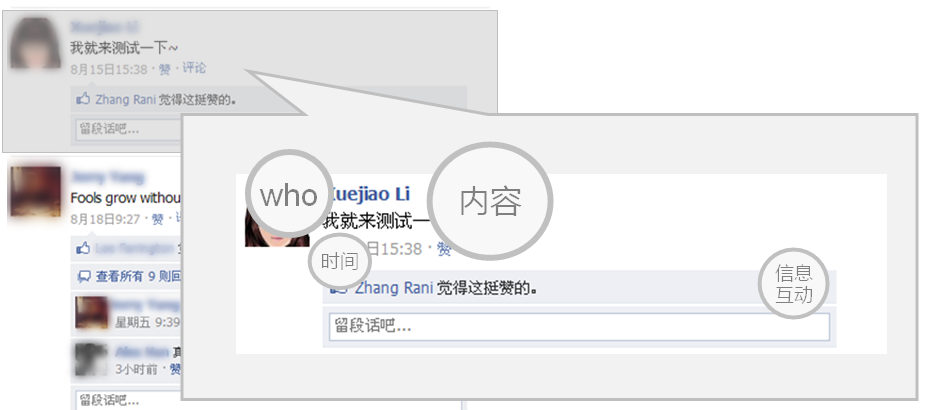 如果把sns网站中的feed按照这个方式来提炼,那么每条信息可以重点简化为“谁说了什么,在什么时间(什么地点/通过什么方式)”当然sns是少不了用户的互动,因此还有一个信息互动模块。总结每条信息的构成主要由“人+内容+时间(地点/来源/方式)+信息互动”。