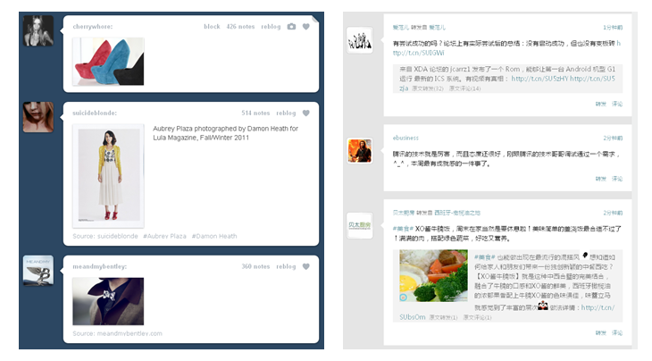 Tumblr和轻博客,则是在视觉上通过明显的色块区分来强调信息区块,能够明显感受到内容清晰,阅读顺畅,提高获取信息的效率。