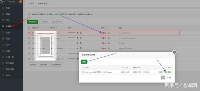 当然除了网站内容,数据库内容也是需要下载一起的,我们点击左边的数据库,选择相应的网站数据库,点击备份后即可下载了。现在我们整个网站的整体和数据库都打包完整了。很文博客-https://www.hinku.com/23232.html