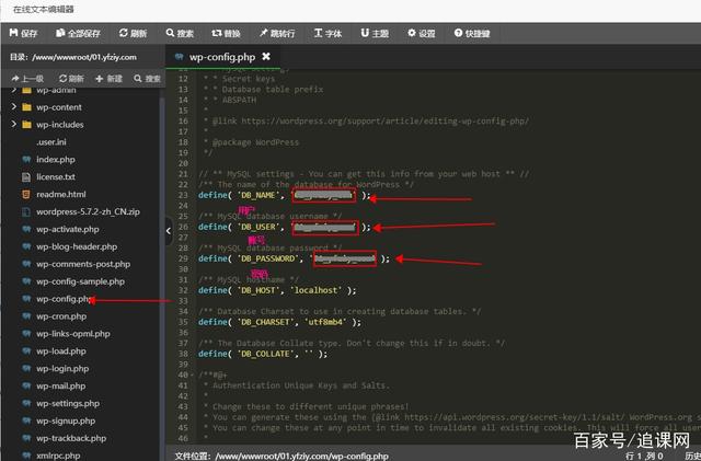 接下来我们就需要在另一台服务器操作了,我们在另一台服务器上搭建好BT面板,进入面板,新建一个网站,设置好域名数据库,我们就可以把先前备份的网站内容上传到根目录解压出来(域名和之前不一样,我们需要修改备份内容的域名与现在的域名一样,可以代码编辑器搜索备份包之前的域名替换成现在的域名保存,重新打包一下上传即可),然后我们进入根目录的wp-config.php修改刚才对应的数据库账号密码信息。