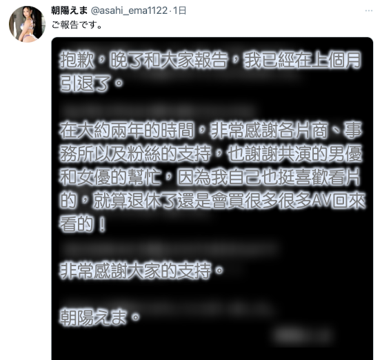 这样子还撑两年也不错了,虽然又是换名又是亲戚不计较地用各种化名在素人企划中演出,但能在竞争激烈的这一行待这么久也是很成功了。只是随着片子Offer愈来愈少,要自己一个人演出作品愈来愈难再加上年纪愈来愈大,朝陽えま(朝阳惠麻)也和一般女优一样面临了去留问题,而她也很干脆地选择了引退: