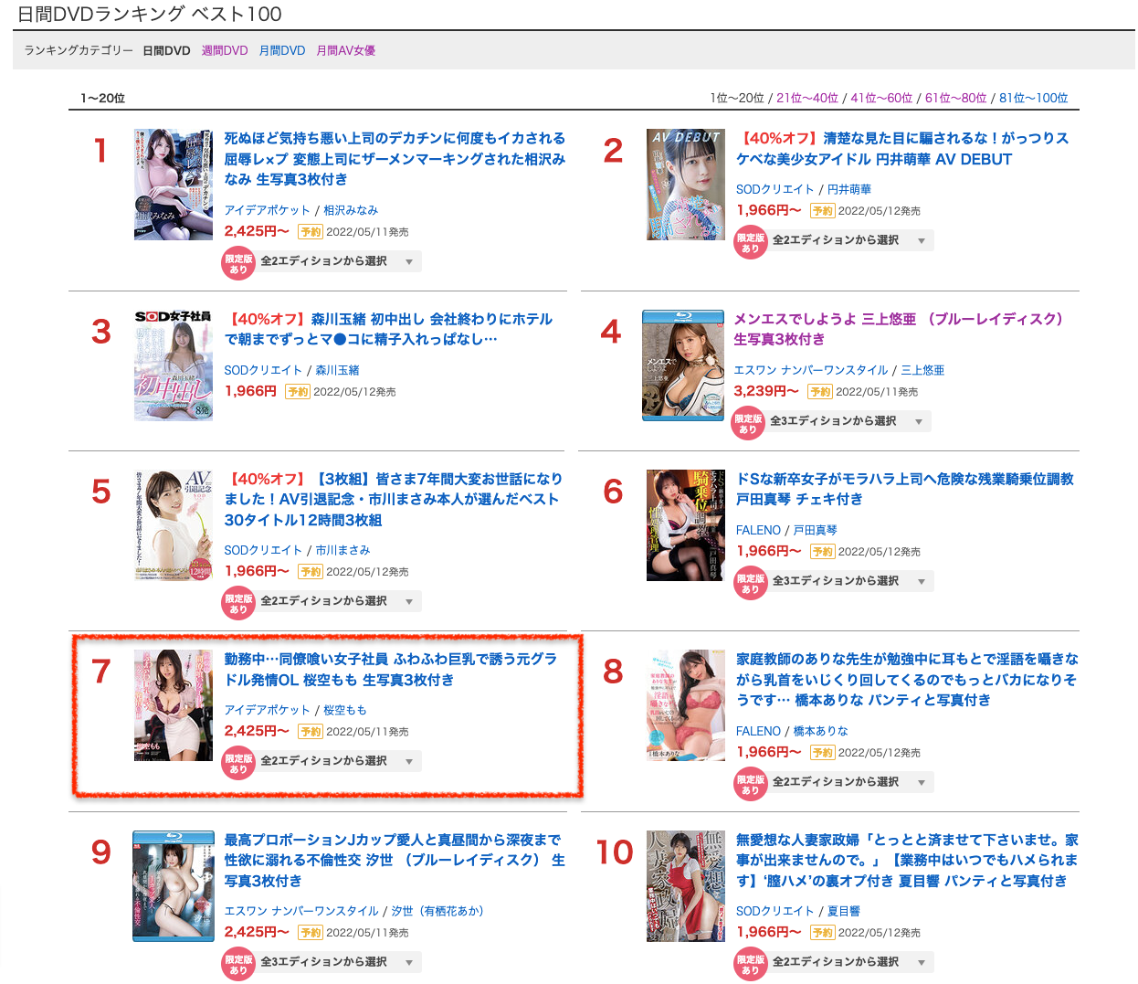 所以我就想问了,为什么ideapocket这次要省略让桜空もも(樱空桃)重返荣耀的关键字?是故意的还是不小心忘记了?不过看起来不提中出し对她的影响也不大,在昨天的销售排行榜上她又是IP社仅次于相沢みなみ(相泽南)的销售好手: