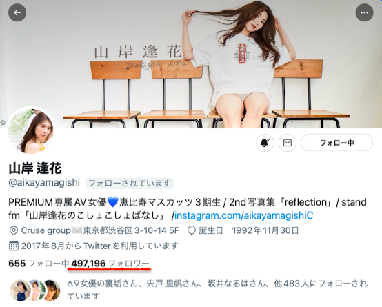 也许有些朋友注意到了,山岸逢花的twitter追踪数已经超越橋本ありな(桥本有菜)了〜很文博客-https://www.hinku.com/25425.html