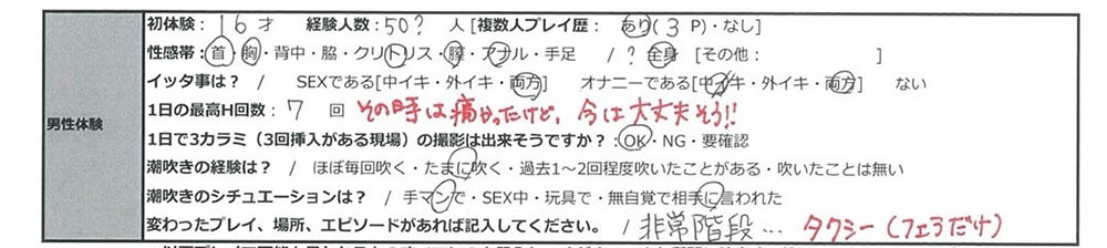 好厉害对不对?不过真的进了摄影棚呢?七瀬アリス(七濑爱丽丝)就写得很清楚,比较口味轻的演出如稍微绑起来、不是那么暴力的强奸及凌辱、轮奸、颜射、身体涂鸦以及拍摄尿尿的企划都可以接受,比较受不了的是被打屁股;而重口味的演出方面,她勾选了紧缚、黑人以及掐脖子,对于「咬珠」和「头被按到水里」就敬谢不敏了⋯