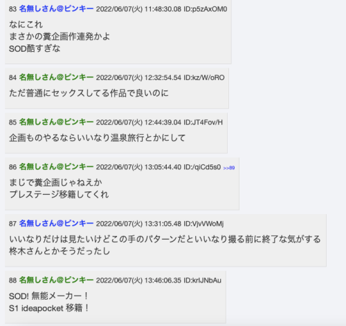 非也非也,继正式的出道作被骂爆后,这支作品在日本论坛的评价也很糟糕,虽然大家都知道SOD是要丢变化球吸引影迷注意,不过83楼的留言者是说SOD「粪企画作连発」,86楼则是直接要她移籍去Prestige,88楼则是大骂SOD是无能片商,希望她赶快移籍去S1或ideapocket,后面还有人抱怨贵重的初3P竟然是用这种形式浪费掉了⋯
