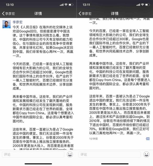 昨日,李彦宏发布朋友圈,称如果Google决定回到中国,我们非常有信心再PK一次,再赢一次。很文博客-https://www.hinku.com/29776.html