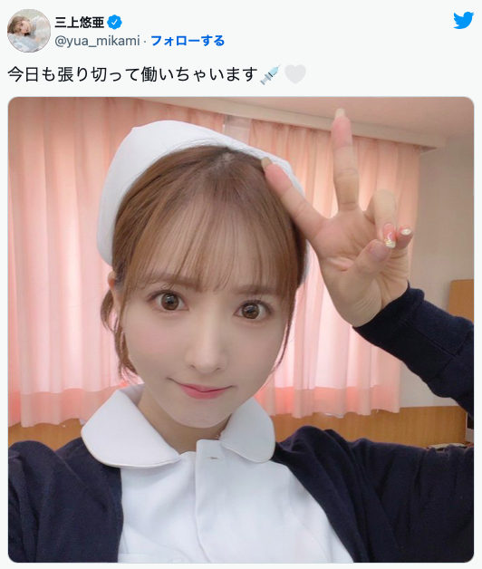 因为不久前她在社群上传了一系列护士服的照片,因为三上自出道到现在只有在「国民的アイドル三上悠亜の31コス! コスった悠亜で毎日シコって4時間31変化SP」扮演过护士,但她始终没有一支全程扮演护士的作品,这次似乎是要解禁了…