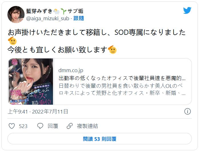 将在8月份移籍到片商「SODcreate」,